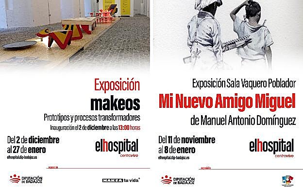 En Badajoz se podrán seguir visitando varias exposiciones. Hasta el 8 de enero se puede visitar en la Sala Vaquero Pobladorde 'El Hospital' continuará abierta la muestra 'Mi nuevo amigo Miguel' de Manuel Antonio Domínguez. Además, hasta el 5 de febrero también se podrá disfrutar en la galería central de este mismo espacio de la exposición 'Makeos. Prototipos y procesos transformadores' de Makea tu vida. Esta propuesta narra un recorrido por su trayectoria a través de diez proyectos en los que se muestran diferentes escalas, formatos y contextos que ponen de relieve el potencial transformador de las prácticas colaborativas y la optimización de recursos.