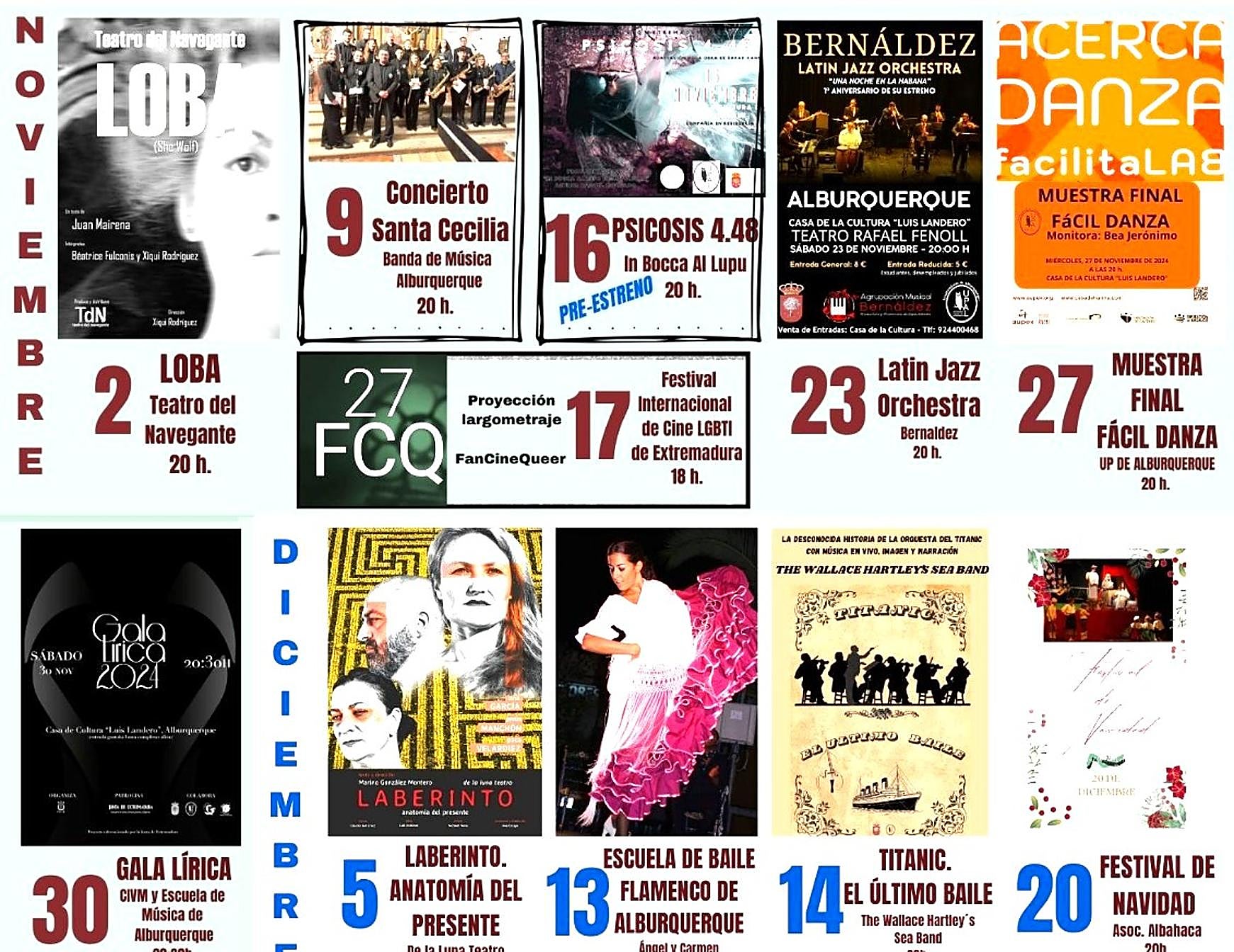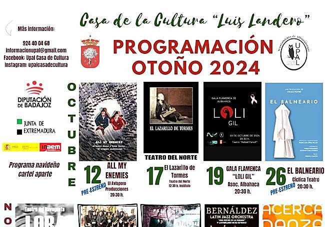 La directora de la Universidad Popular de Alburquerque detalló la programación del otoño cultural, que cuenta con seis preestrenos y representaciones de otras obras, «a cargo algunas de las mejores compañías teatrales extremeñas y nacionales, como son El Balneario, El Avispero, Psicosis, Calema, Teatro del Navegante o Teatro del Norte, por lo que somos un referente a nivel extremeño en la programación teatral y con compañías residentes. En cuanto a danza, se contará con cuatro actuaciones, incluyendo la Gala Flamenca 'Loli Gil' de Albahaca, y la muestra final del proyecto Acerca Danza, cuya monitora es la alburquerqueña Bea Jerónimo. En lo que respecta a la música en directo, repite actuación la Bernáldez latín Jazz Orchestra, Concierto de Santa Cecilia de la banda local, Festival de Navidad de Albahaca, Gala Lírica, y el proyecto de Mariola del Pozo 'Titanic. El último baile'. Por último, una muestra del Festival Internacional del cine LGTBI de Extremadura. Además de todo esto, en un cartel aparte se mostrará la programación navideña.