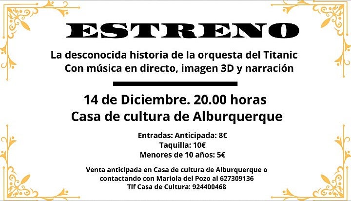 Ocho músicos profesionales, residentes en Extremadura y originarios de diferentes lugares de España, homenajean y recrean la formación original de la orquesta que iba a bordo del trasatlántico británico Titanic aquel histórico 15 de abril de 1912, día de su hundimiento, dando a conocer sus nombres, el repertorio original que tocaron en la travesía y algunos retazos de sus vidas. Bajo la denominación de Wallace Hartley Sea Band se reúnen para estrenar en Alburquerque el espectáculo 'Titanic, el último baile'.