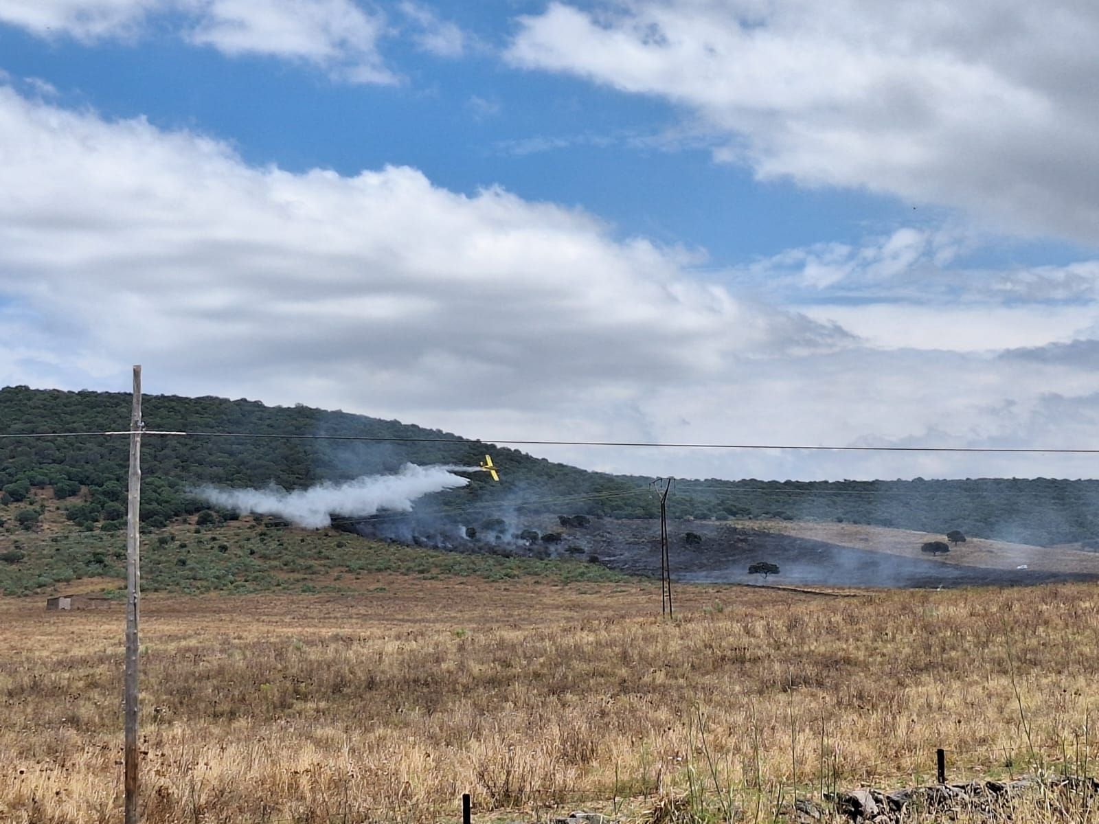 Dos retenes del Plan INFOEX y después un vehículo del CPEI de la Diputación de Badajoz intervinieron también por protocolo para realizar labores terrestres para evitar que el incendio se extendiera ya en la sierra, con más vegetación arbustiva, pues hasta el momento sólo se habían quemado varias hectáreas de pasto, poniendo también en peligro varias viviendas aisladas.