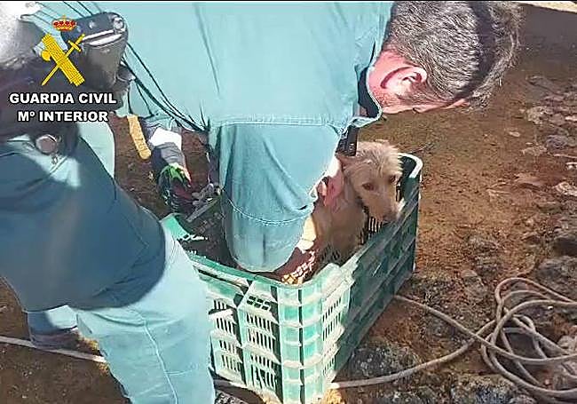 Agentes del SEPRONA de la Guardia Civil de Azuaga, bomberos y un guarda de un coto del municipio azuageño rescataron el pasado viernes a un perro que cayó a un pozo de unos diez metros de altura.