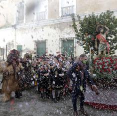 Ayer, medio centenar de vecinos de Acehúche se vistieron de Carantoñas y acompañaron a San Sebastián por las calles de su localidad entre tamboriles y reverencias. Hoy se repetirá una vez más este montaje que finaliza cuando los hombres disfrazados se dispersan en el momento en el que aparece la 'vaca-tora', otra carantoña, que lleva cuernos y asusta a las demás.