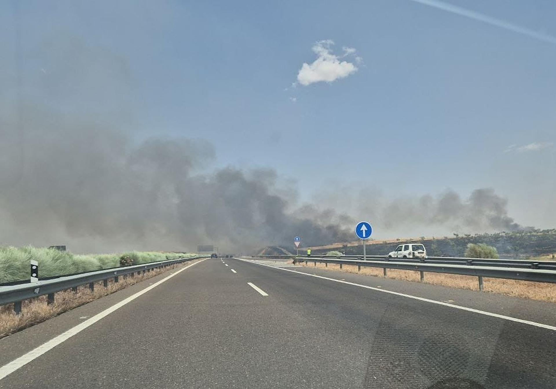 El humo generado por las llamas obligaba a cortar momentáneamente la circulación por la A-66 en dirección a Sevilla, a la altura de Fuente de Cantos. En concreto, el corte se producía en el kilómetro 704 y el tráfico ha sido desviado durante ese tiempo por la N-630.