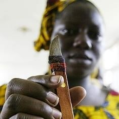 Una mujer de Costa de Marfil sujeta una herramienta antes de realizar una ablación.