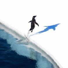 Un pingüino salta sobre el hielo en el mar de Ross.