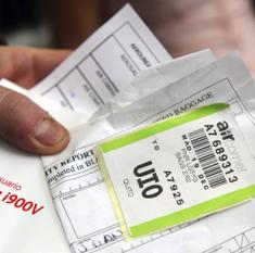 Un viajero sostiene varios billetes de avión.