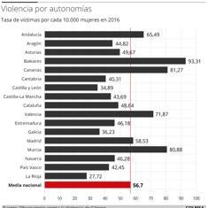 En 2016 los juzgados españoles recibieron un total de 142. 893 denuncias por violencia de género, lo que supuso un incremento de 10,6 puntos respecto de 2015, cuando fueron 129.193. Las 134.462 víctimas del ejercicio -un 30% de ellas extranjeras- hicieron que la tasa media nacional de víctimas ya alcanzase a 56,7 mujeres de cada 10.000. Si el problema es importante en todo el país, destacan de forma notable Baleares, con una ratio de 93,3 vejadas o agredidas por cada 10.000, y Canarias y Murcia, con 81, mientras que la tasa más baja se da en La Rioja, con 27,7.