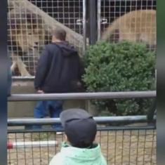 Un hombre se empeña en mantener un cara a cara con dos leones en el zoo de Ámsterdam