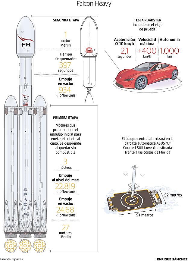 En cualquier caso, Musk ha logrado todos sus objetivos. En primer lugar, estrenar con éxito su cohete pesado, con 70 metros de altura y capaz de elevar a la órbita hasta 65 toneladas. También ha conseguido por primera vez recuperar las primeras etapas de los tres propulsores del cohete, que regresaron a la Tierra de forma controlada minutos después del despegue. Y en último lugar, una campaña publicitaria espectacular para su compañía de coches eléctricos.