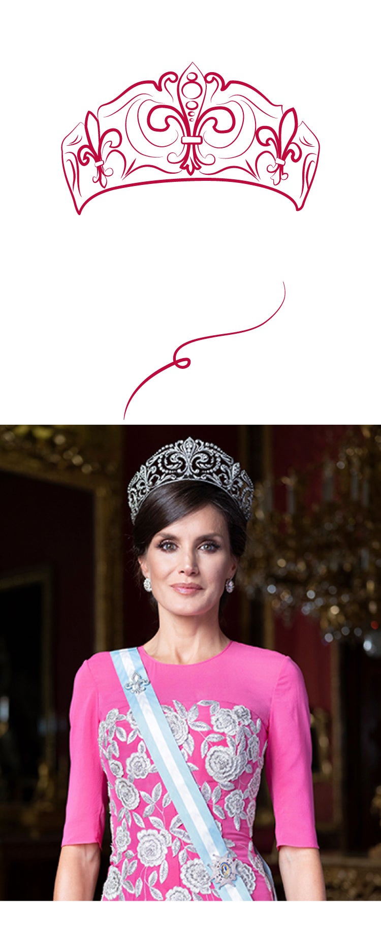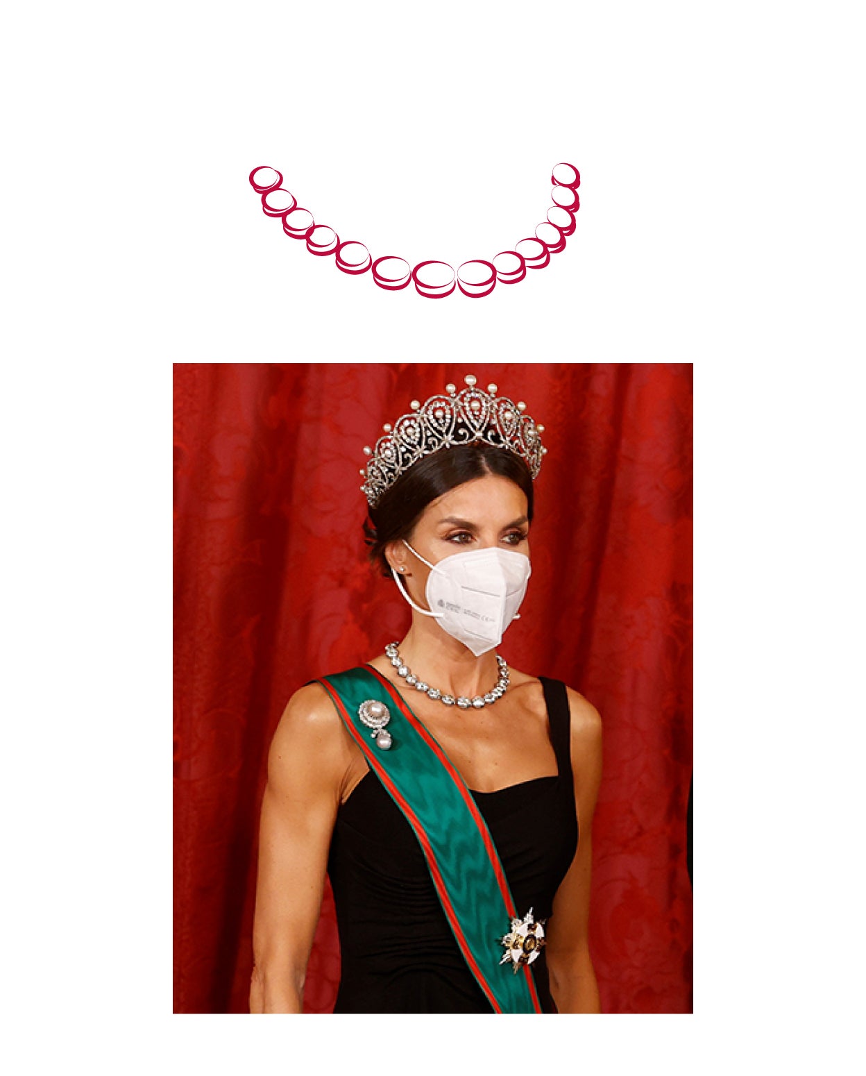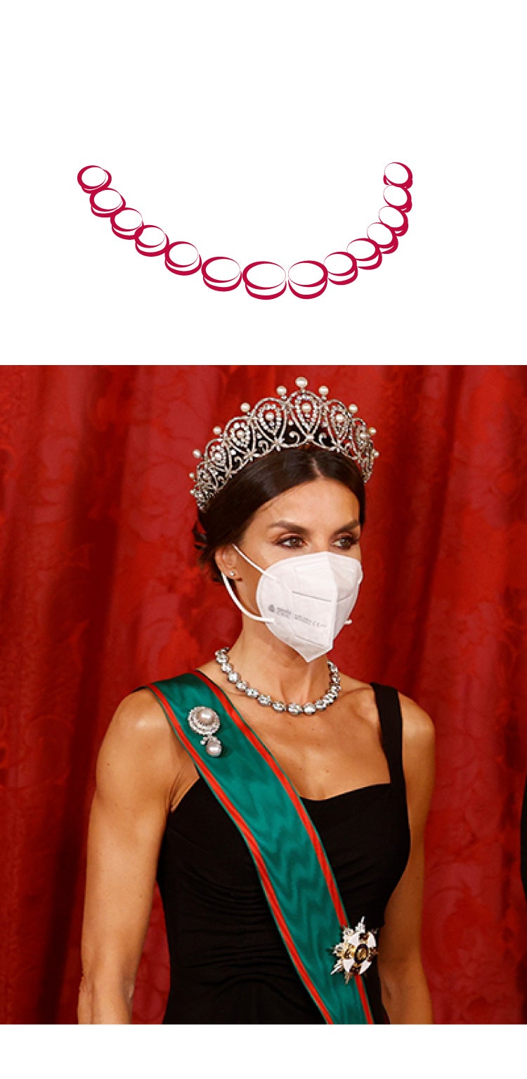 Viene a ser la gran corona de la que carece la monarquía española. Es la pieza más representativa del joyero de los borbones. Firmada por la casa Ansorena, fue un regalo de Alfonso XIII a su entonces prometida y fue la tiara que usó Victoria Eugenia para su boda en 1906. La reina Sofía la reservó para las grandes ocasiones; doña Letizia, también. La 'estrenó' en febrero de 2017, en la cena en honor del presidente argentino, Mauricio Macri, y su mujer, Juliana Awada, en el Palacio Real. Y la ha lucido también en varios de sus viajes de Estado: Japón, Reino Unido, Suecia...