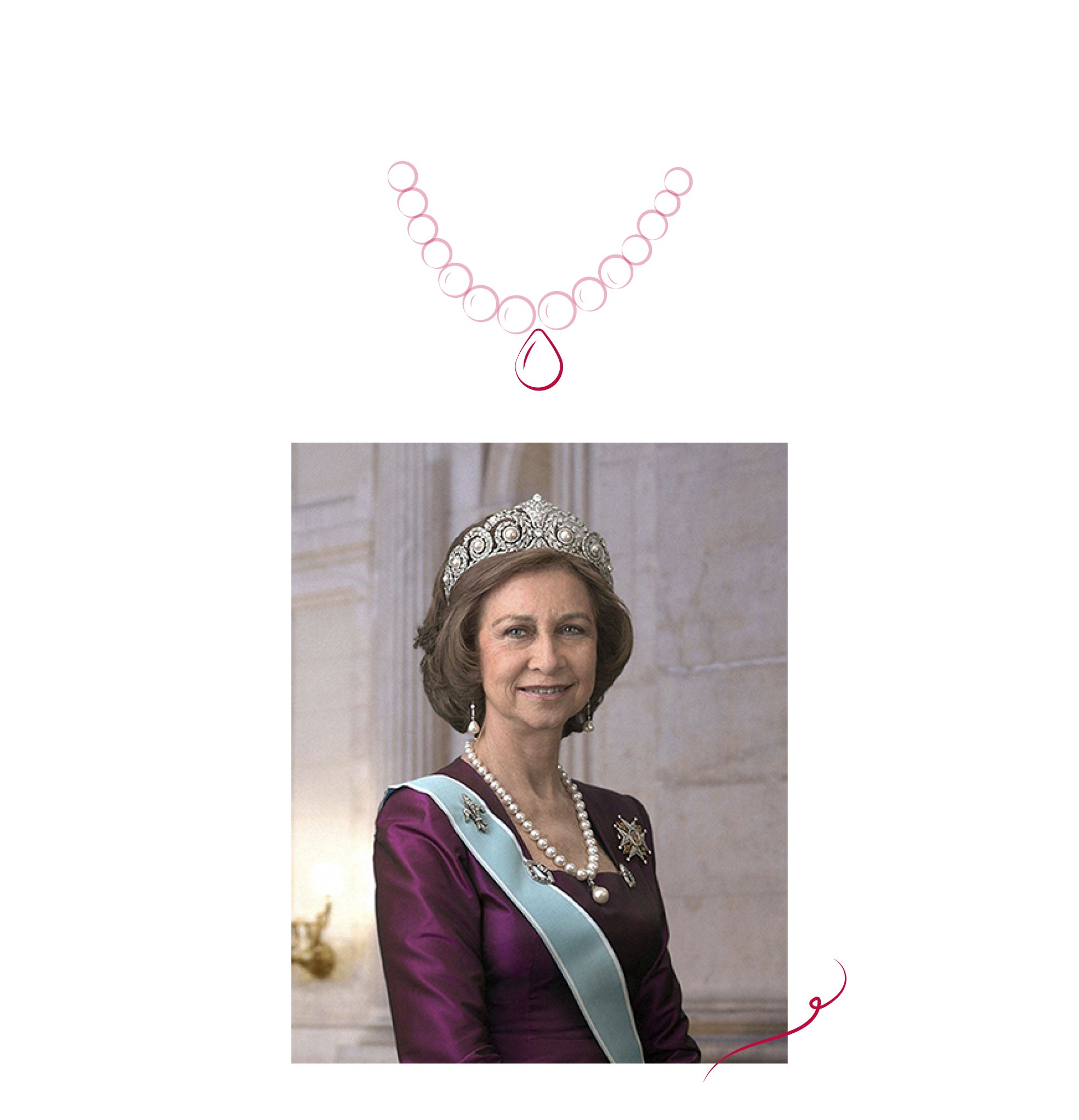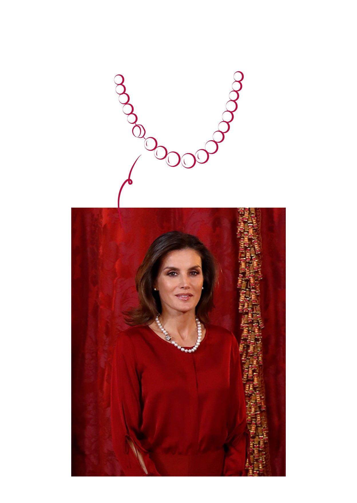 Fue la primera pieza de las 'joyas de pasar' que usó doña Letizia. Se lo puso en 2015, en la ceremonia de los Premios Princesa de Asturias. Victoria Eugenia heredó este collar, que está considerada la joya más valiosa de Palacio, de su suegra, María Cristina. Alfonso XII no lo había comprado para ella, sino para su primera esposa, la reina Mercedes. El original tenía 41 perlas. Luego se aligeró y el actual tiene 37.