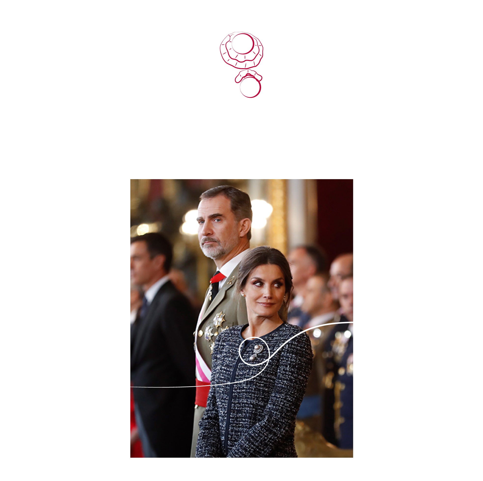 La perla que pende del broche se confunde algunas veces con 'La Peregrina', pese a que su tamaño y color son distintos. Lo 'estrenó' Letizia en la Pascula Militar de 2019. Este pasado enero, en el mismo acto, protagonizó una curiosa anécdota, ya que se le desprendió el broche en el patio de armas.