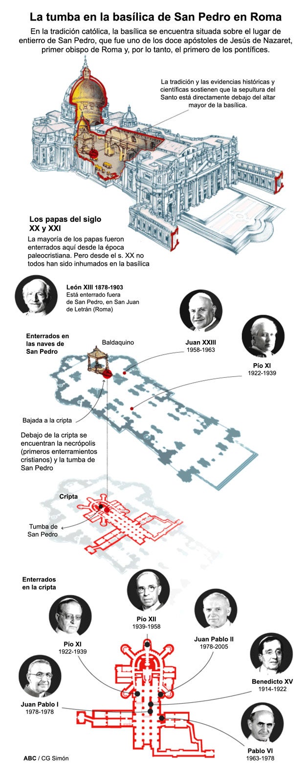 «Ahora estamos en la vertical del baldaquino de Bernini, a unos 10 metros de profundidad de la basílica de San Pedro». La imaginación se ... dispara ante las explicaciones de la historiadora que guía a un grupo de visitantes por el subsuelo de las grutas vaticanas, que soportan al mayor templo de la cristiandad. En Galilea, junto al lago Tiberiades, una roca recuerda en el santuario del Primado la confirmación de Jesús al apóstol Simón Pedro como pastor de su Iglesia, el primer papa. «Sobre esta roca edificaré mi iglesia», se lee en el Evangelio de Mateo. Pero la metáfora bíblica adquiere en ese escenario de las profundidades romanas todo su significado y resulta inevitable reflexionar sobre la doctrina de la sucesión papal y asociarlo con el peso de la púrpura, un peso que a Benedicto XVI le llevó a la renuncia.