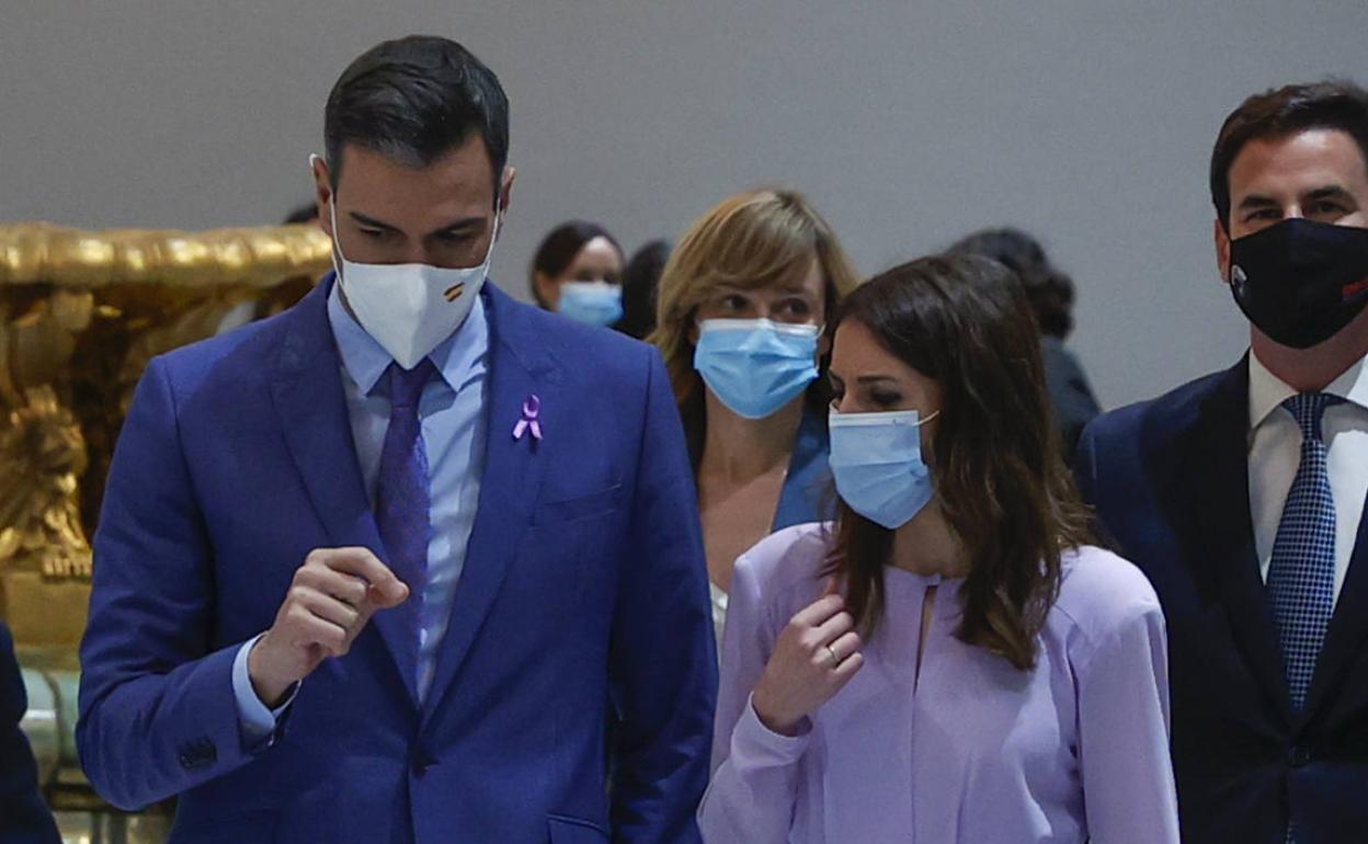 Sánchez escucha en primera fila, sube al estrado del que no se bajará hasta la «foto de familia» al lado de Montero. «Mañana las calles de nuestro país se llenarán de mujeres reivindicando sus derechos y libertad». Hace un repaso por las activistas españolas de los dos últimos siglos. «Desde todos los ámbitos los movimientos y asociaciones de mujeres lucharon para que se transformara la estructura hegemónica y patriarcal. Así pudimos legislar permisos remunerados, protección frente a la violencia de género, donde damos pasos importantes con la 'ley del sí es sí... Los avances suceden pero queda mucho camino por hacer. Seguimos teniendo ejemplos de desigualdad».