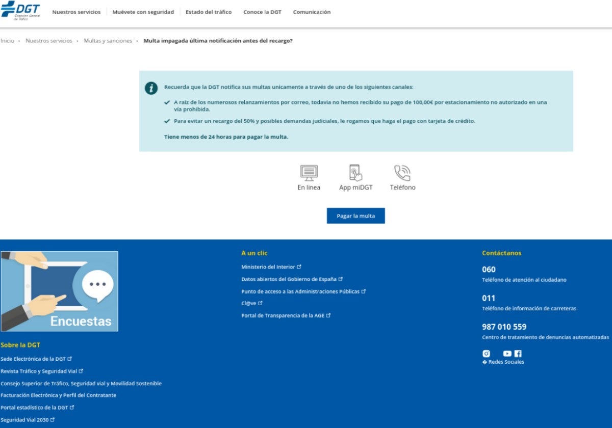 Resulta especialmente llamativo que, al acceder a los enlaces, la página parece absolutamente real y procedente de la DGT, pero no lo es. «El usuario es dirigido a una página que imita el diseño y el logo de la web oficial de la DGT. En esta pantalla, se le informa que tiene menos de 24 horas para pagar la multa, advirtiéndole que, de no hacerlo, se le aplicará un recargo del 50% y podría enfrentarse a posibles demandas legales», apuntan. Por eso, es importante que observes el remitente del email, verás que no tiene nada que ver con la DGT.