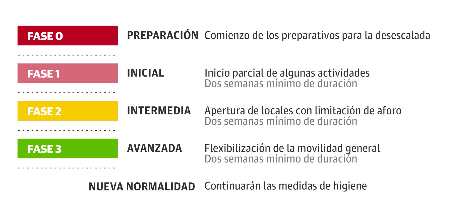 El plan de desescalada impulsado por el Gobierno se compone de cuatro fases, a las que los diferentes territorios solo accederán si son capaces de cumplir con los marcadores que el Ministerio de Sanidad ha fijado: la capacidad sanitaria, la situación epidemiológica y los datos socioeconómicos y de movilidad. Así, se calcula que esta transición hacia «la nueva normalidad» durará al menos cerca de ocho semanas, lo que no quiere decir que, en caso de rebrotes se den pasos atrás.