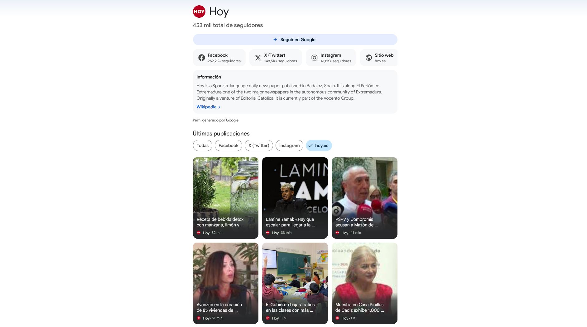 Seguir al Diario HOY en Google Discover te permite acceder de manera más fácil y directa a la información que realmente te interesa. Podrás mantenerte al día de la actualidad de Extremadura, contada siempre con rigor y cercanía, y disfrutar de nuestros contenidos en el formato que más te guste: reportajes, entrevistas, vídeos, opinión, recetas, reseñas y mucho más, todo desde tu móvil.