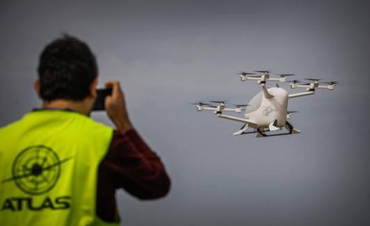 Miércoles, al mediodía. Centro de vuelos experimentales Atlas. Un centenar de personas permanece de pie, como estatuas. Corre una brisa fresca y reina un silencio campestre que invita a la relajación. Sin embargo, a poco más de cincuenta metros hay un aparato que concentración todas las miradas. Es blanco, mide seis metros de largo y cinco de alto. La cabina central es amplia, capaz de transportar a tres personas, y está rodeada por cuatro drones, cuatro grandes hélices. Recuerda a un mosquito mecánico. A una nave espacial futurista. A Blade Runner. Y entonces, de repente, el ruido.