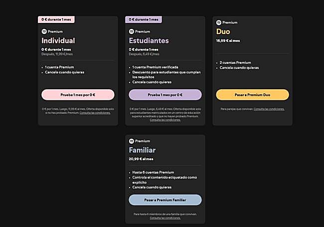 El plan para estudiantes tendrá un coste de 6,49 euros al mes e incluye todos los beneficios de Premium con un descuento especial para quienes acrediten su condición académica. El plan Premium individual pasará a costar 11,99 euros al mes, frente a los 10,99 euros anteriores, ofreciendo acceso sin anuncios, posibilidad de escuchar música sin conexión y reproducción ilimitada.