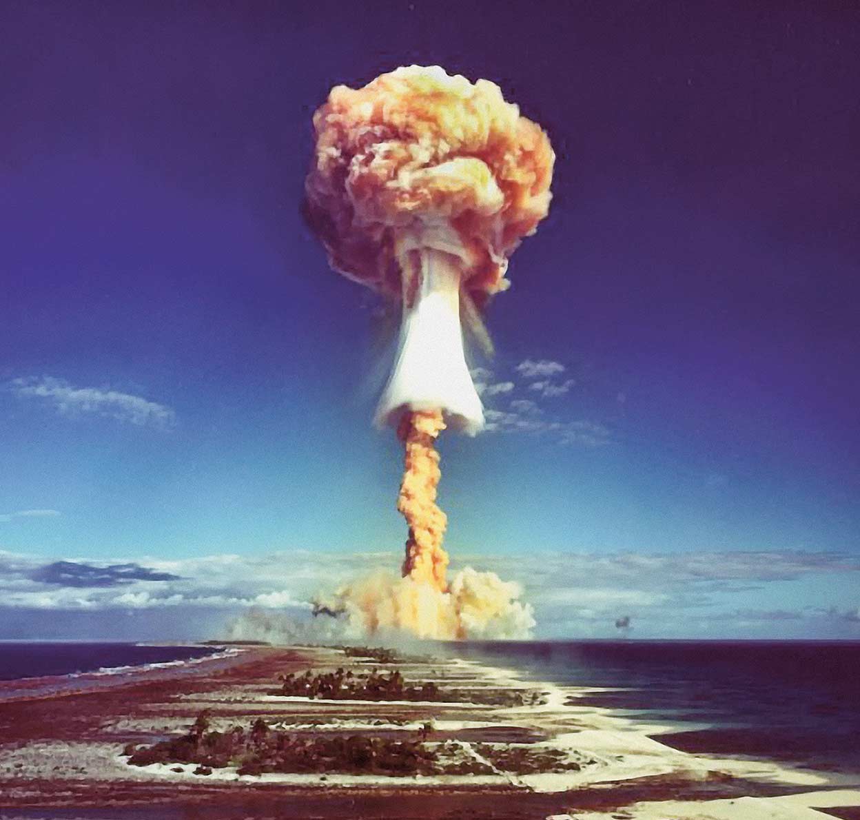 Las armas de Francia. En julio de 2019, Macron posó frente al nuevo y poderoso submarino nuclear francés Suffren. Francia posee 300 cabezas nucleares y 4 submarinos. En la imagen superior que abre este reportaje, una de las detonaciones de bombas atómicas realizadas por Francia en el atolón de Mururoa (Polinesia Francesa) en 1971. Desde 1966 hasta 1996 se detonaron en estas islas 193 bombas como pruebas controladas de armamento nuclear.