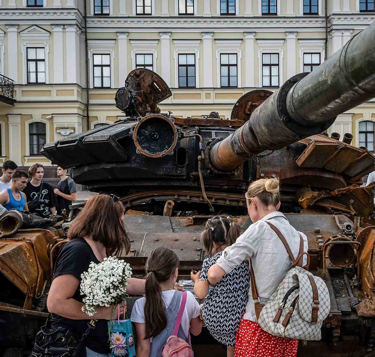 Más de 150 días después del comienzo de la invasión a Ucrania, muchos de sus habitantes, especialmente en Kiev y sus alrededores, logran retomar sus vidas cotidianas, en las que la guerra de Ucrania sigue estando presente. No sólo en los telediarios y en el discurso diario del Presidente, Volodímir Zelenski​, sino en el espacio urbano, salpicado de armamento y tanques rusos destruidos por las fuerzas ucranianas durante la fallida ofensiva de Putin sobre la capital. Y es que de momento el presidente ruso ha fracasado en su intento por controlar Kiev, y sus bajas son más de las esperadas. Ucrania contabiliza 43.750 soldados rusos muertos y Estados Unidos, 75.000, entre muertos y heridos, la mitad de los 150.000 que Putin llegó a desplegar al inicio del conflicto, el 24 de febrero. En la imagen superior se puede ver el museo al aire libre en el que las Fuerzas Armadas ucranianas muestran algunos de los más avanzados y sofisticados tanques rusos destruidos junto a otros vehículos militares —hay incluso resto de un avión bombardero derribado— y material bélico en general.
