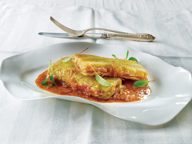 Lo primero, un consejo. A veces, las acelgas tienen ya hojas demasiado grandes y ásperas al tacto y su color se está tornando amarillento. Esto se debe a que están por florecer o ya lo han hecho, lo cual se traduce en que sus pencas tomarán un sabor amargo, que no será muy agradable al cocinar. Una vez bien elegidas las acelgas, se sazona el agua, se añaden las pencas y se cuecen 15 minutos. Sobre la mesa, se rellenan las pencas de jamón y queso. Se pasan por harina y huevo y se fríen en aceite. De la salsa. se rehogan el ajo y la chalota en aceite de oliva. Se añaden una pizca de harina, el vino blanco y, tras unos segundos, también la salsa de tomate. Poco a poco se añade el caldo de acelga.