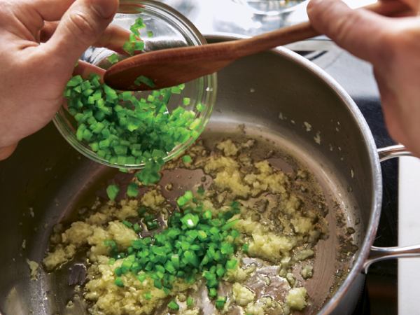 1. Se colocan en una olla con aceite de oliva los ajos, las cebolletas y el pimiento. Se deja pochar al fuego 20 minutos.