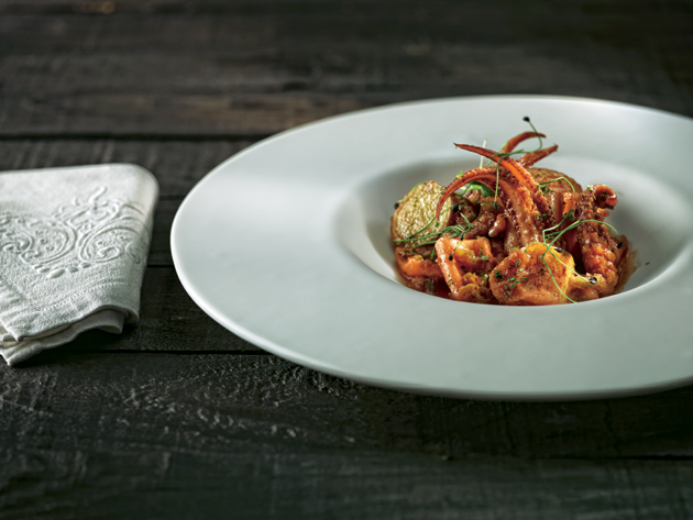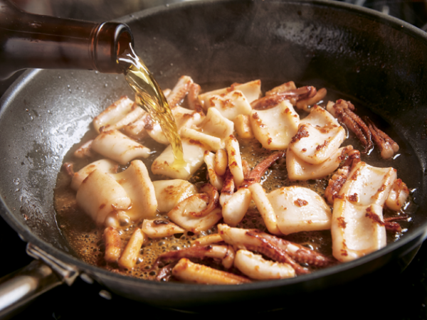 3. Se desglasan con armañac los trozos de calamar mientras los salteamos en una sartén, de a pocos y con sal.