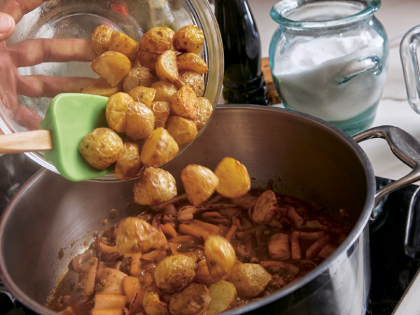 4. Se añaden las patatas a los calamares, una vez guisados estos 40 minutos, y se dejan hervir unos minutos más.
