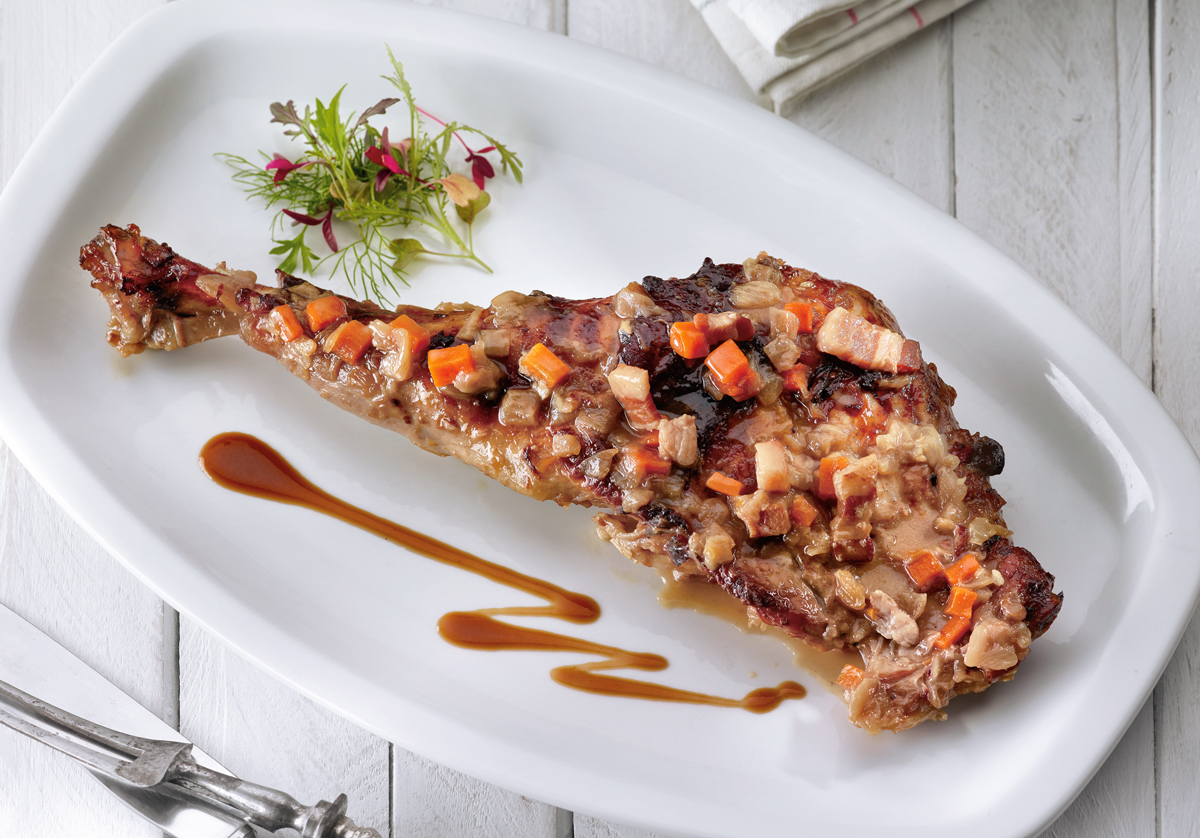 4. Se sacan del horno, pasado el tiempo, y se cuela el líquido, que reducimos aparte, al fuego, hasta encontrar el gusto y la densidad deseados. Se sirven las paletillas con las verduras, los ajos, los lardones de tocineta y la salsa.