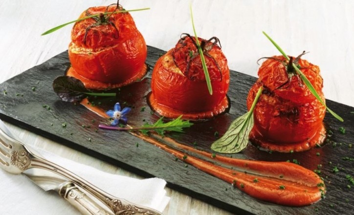 4. Se rellenan los tomates con el sofrito mezclado con la farsa de las salchichas. Luego se hornean 25 minutos. ¡Y listo!