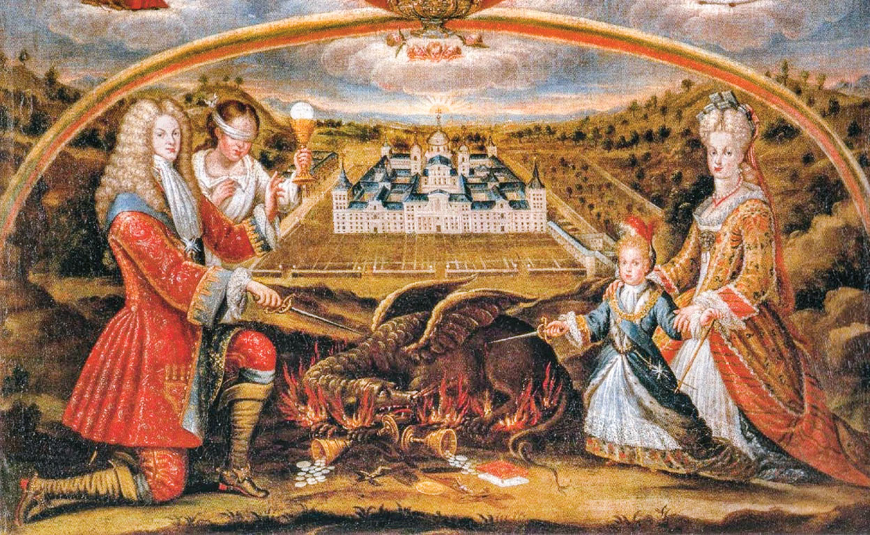 El lienzo encierra una lección de historia por lo que tiene de desiderátum de la monarquía borbónica recién implantada en España. En el centro: el monasterio-palacio de El Escorial, que subraya la continuidad de los Borbones como sucesores legítimos de los Austrias. A la izquierda: el rey Felipe V acomete con su estoque a un dragón que representa la herejía protestante profesada por las potencias que apoyaban la candidatura austriaca, Inglaterra y las Provincias Unidas. A la derecha: la reina María Luisa anima a su hijito Luis, de 5 años, para que también hiera al dragón imitando a su augusto padre. Como sucesor del trono, el niño Luis aparece ataviado con los símbolos de la monarquía católica, collar del toisón de oro, bengala de mando en la mano y manto de armiño.