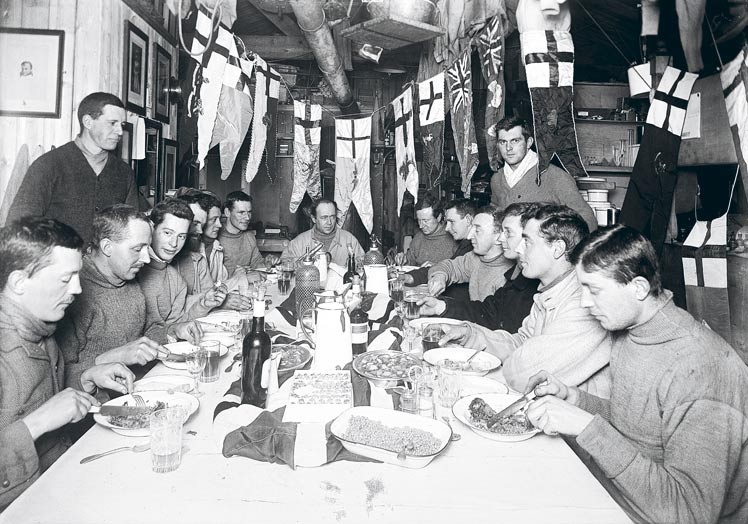 Scott, presidiendo la mesa, celebra su 43 cumpleaños –el 6 de junio de 1911– en el cabo Evans. El capitán sabía que Amundsen estaba intentando llegar al Polo Sur al mismo tiempo que él, pero eso no lo detuvo. Tampoco lo hicieron las condiciones climatológicas, que fueron nefastas, con 70 grados bajo cero y tormentas.