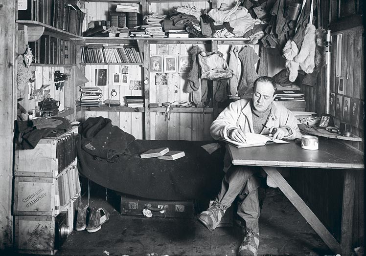 El capitán Robert Scott escribe su diario en su refugio cerca del Polo. La Expedición Antártica Británica, que él protagonizó, también es conocida como Terra Nova por el nombre del barco que los llevó hasta allí. Este espacio y su contenido se conserva en homenaje a Scott y su equipo.