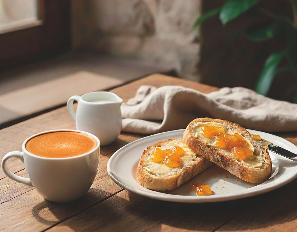 «Café bien cargadito con leche desnatada. Y unas tostadas de pan de barra normal y corriente con mantequilla y mermelada de melocotón».