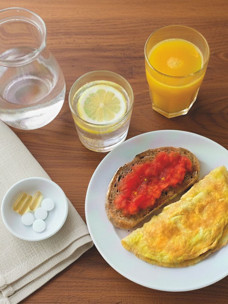«Agua tibia con jengibre rallado y limón; un bocadillo con tomate y tortilla francesa; y un zumo de naranja. Y un platito con cuatro o cinco pastillas, todas las vitaminas que me recomienda la ginecóloga: magnesio, omega 3…».