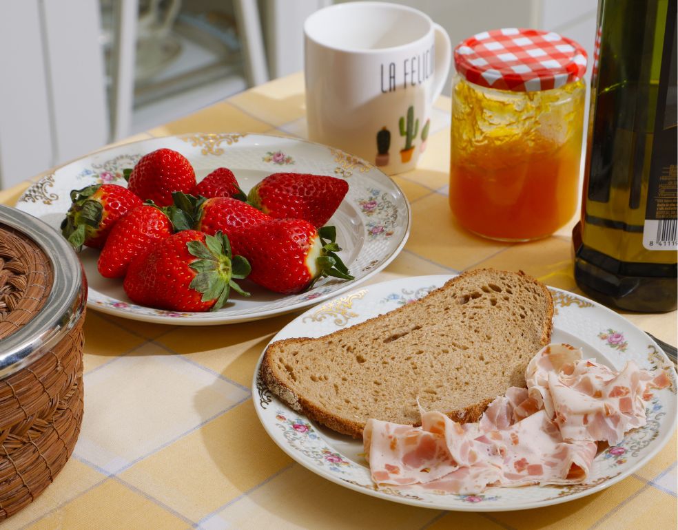 «Pan de hogaza integral de centeno con aceite de oliva y algo de chorizo, pavo, jamón… Un café con leche semi-desnatada. Más tarde, algo de fruta».
