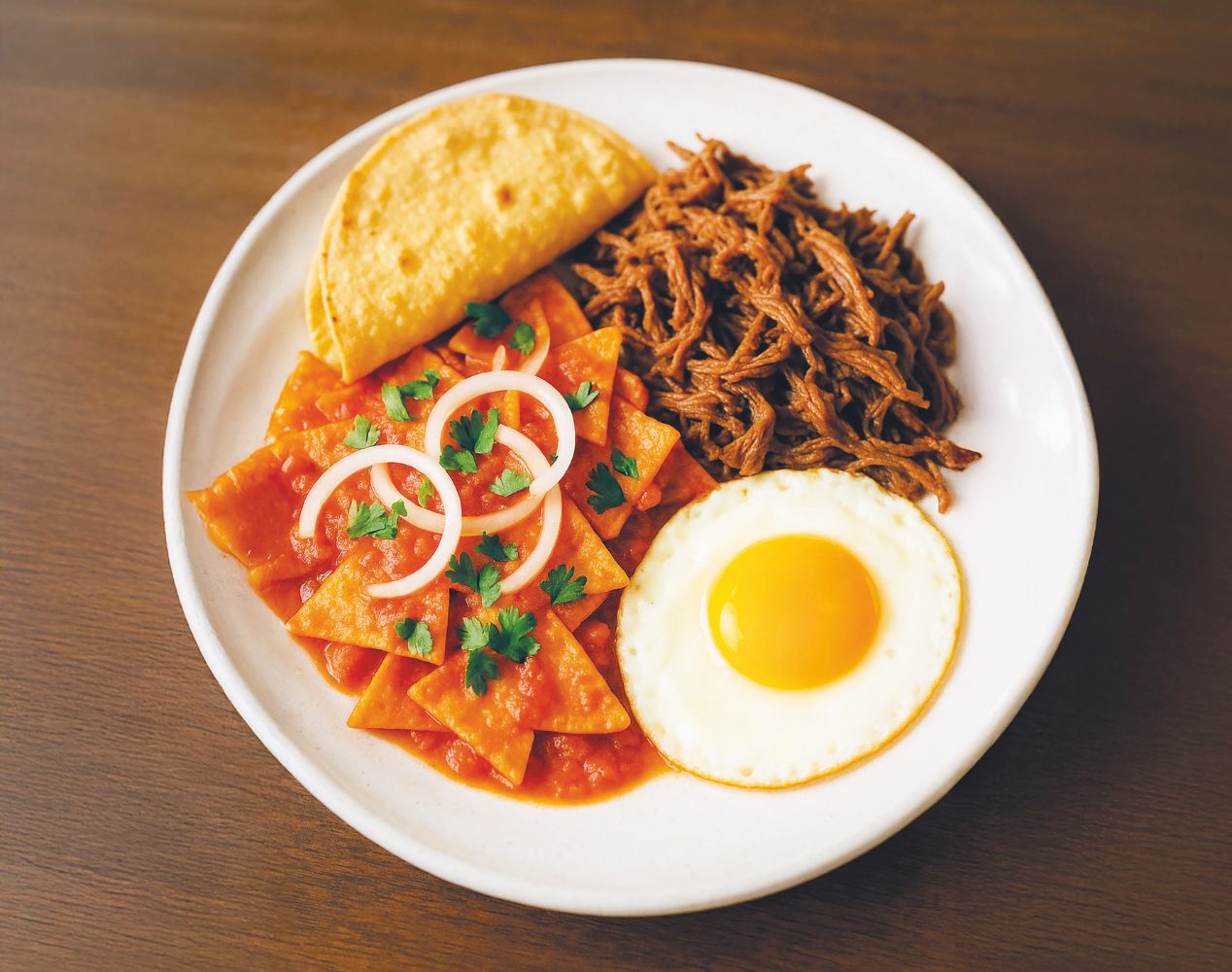 «Chilaquiles, huevos estrellados, tortilla de maíz, queso crema y carne deshilachada en salsa de tomate verde, cebolletas y cilantro. Jugo de naranja y café».