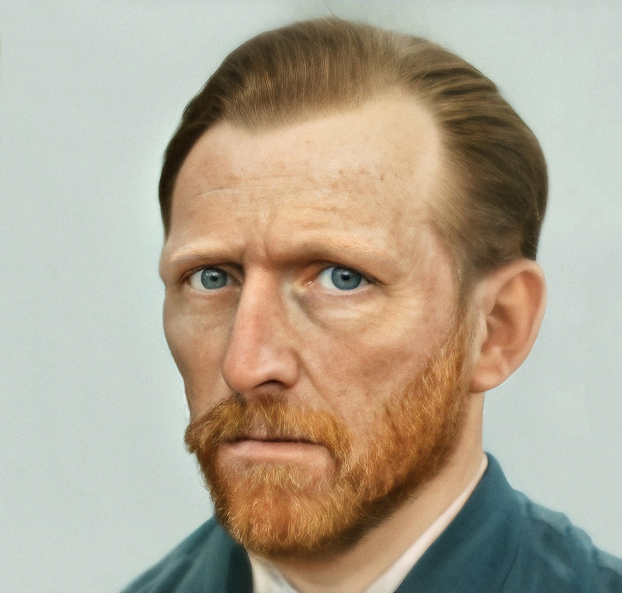 El rostro recreado. El artista holandés Bas Uterwijk ha recreado el rostro de Van Gogh con inteligencia artificial (a la izquierda) a partir de sus autorretratos y las pocas fotografías de él que se conservan (a la derecha).